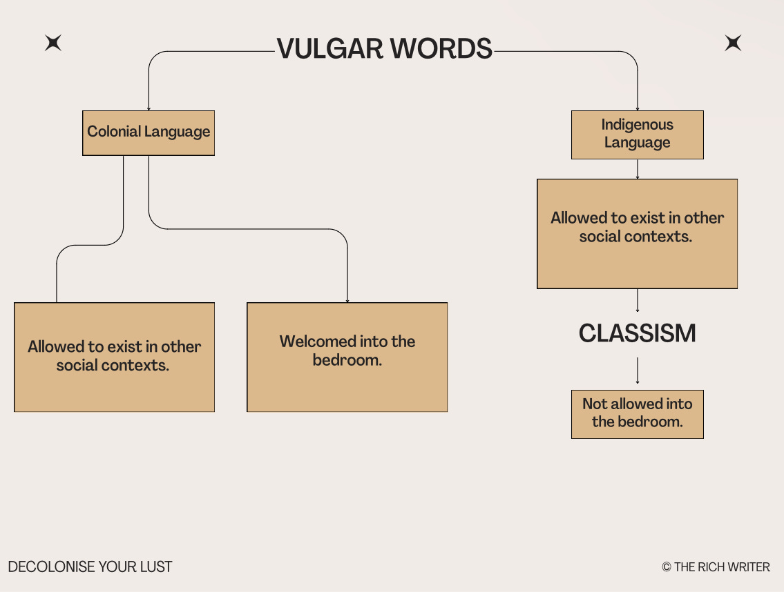 It is curious that while you can find a number of people threatening violence at the prospect of their intimate partner moaning or dirty talking in their indigenous language, you’ll be hard-pressed to find the opposite: someone more fluent in an indigenous language threatening violence on their partner if they were to moan in English. A distinction that shows colonialism’s hand at play.