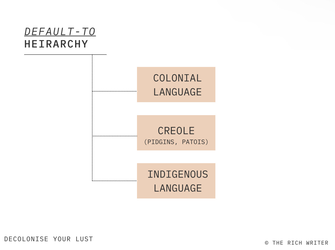 This lingui-economic divide creates class antagonisms and attitudes that fester and manifest in subtle ways. For example, every interaction in the post-colony requires an invisible rock, paper, scissors between both speakers to decide what language to default to, and the overall hierarchy goes like this: